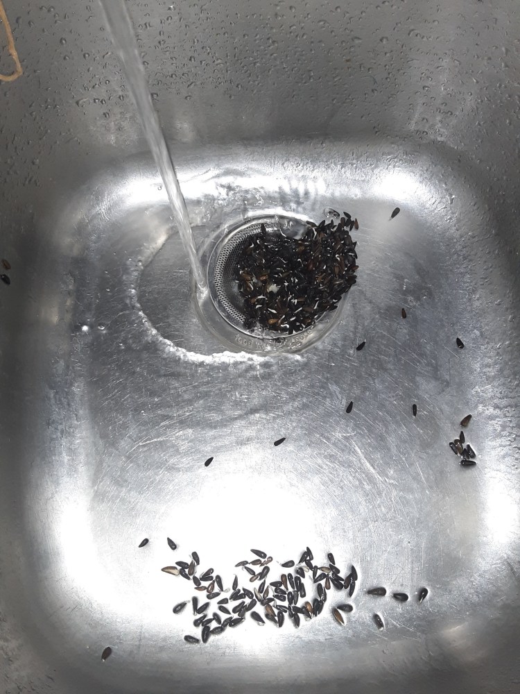 One of the best parts of sprouting is “de-hulling”. That means I am separating the hulls and the un-sprouted seeds. The process takes about two to three rinses.