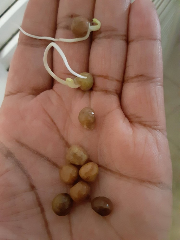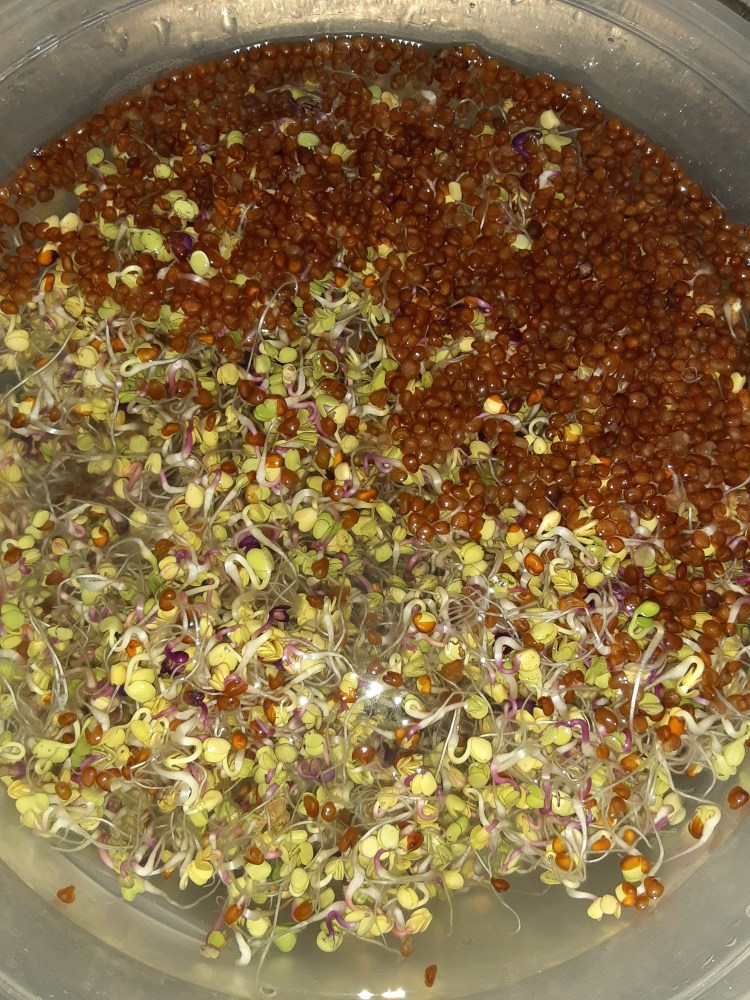 Sprouting using cheesecloth wasn’t a complete failure. As you can see, my legumes did sprout. Yet nothing was edible due to the scent and taste of mildew. I found out later that I was using the wrong covering to drain the water.